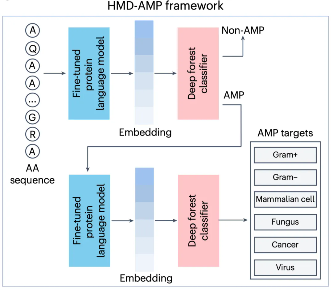 研究团队开发了基于蛋白质语言模型的抗菌肽挖掘工具——HMD-AMP。该框架利用经短肽数据微调的蛋白语言模型ESM-2提取深层序列特征,并结合分层多任务深度森林分类器,构建了端到端预测体系(图1)。与传统方法不同,蛋白质语言模型无需依赖显式序列比对,而是顺利获得大规模无监督学习捕捉蛋白序列中的“隐式语义表示”——即进化与结构层面的深层规律。HMD-AMP不仅能够精准区分抗菌肽与非抗菌肽,还能预测抗菌谱类型,实现更精细的功能评估。
